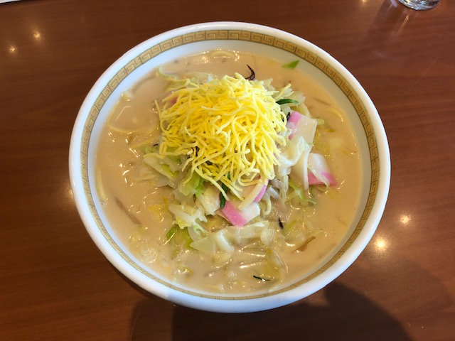 独特食感の麺に、モヤシ、キャベツ、ネギ、豚肉、イカ、エビ、キクラゲ、カマボコと具沢山。こくはあるのだが、ごくごく飲めるタイプの鶏ガラ豚骨スープ。ふわふわの錦糸卵がアクセント。さすがに、ちゃんぽん発祥かつ超有名店の味は素晴らしかったのだ😝。
