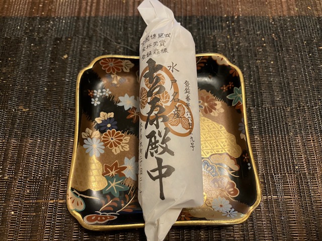 女将さんにお薦めをお伺いしたところ、今日出来上がったばかりの水戸銘菓「吉原殿中」とのこと。実は製造日だけ1本単位の購入ができるのだそうだ。今回はラッキーだったな。ということで今回こたパパは「吉原殿中(130円)」を1本購入させて頂いたのだ😆。