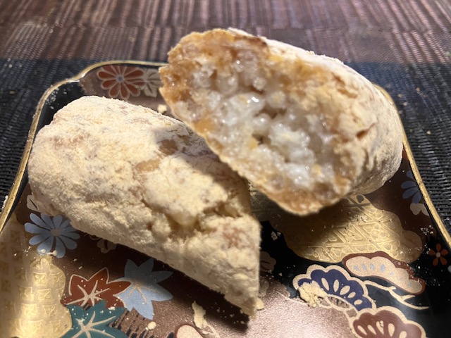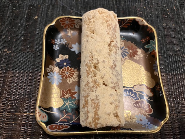 切ってみた感じ。もち米あられを水飴で固め、表面にきな粉をかけたものをオブラートで包んだ水戸郷土銘菓である。食してみると、水飴部分がかなり厚いのだが出来立てで柔らか。きなこの風味と水飴の甘さ、あられの香ばしさが一体となった、素朴で味わい深いお菓子なのだ😄。