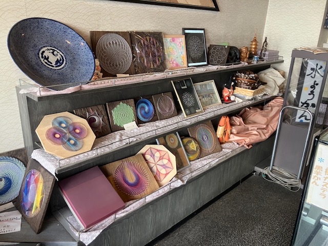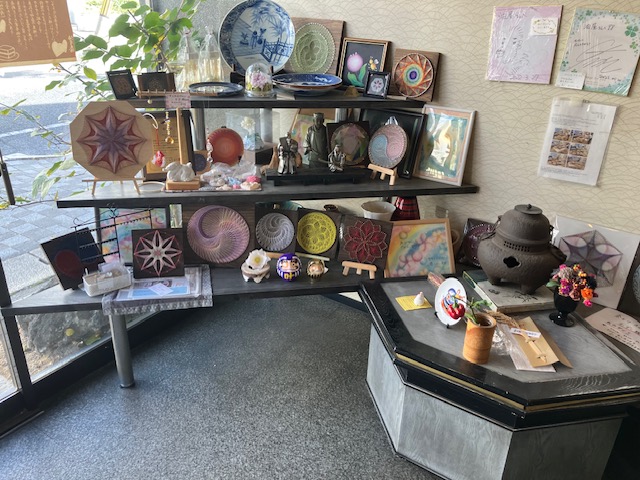 店内左手壁面棚には、皿や茶器など様々な装飾品が展示されているのだ🙂。