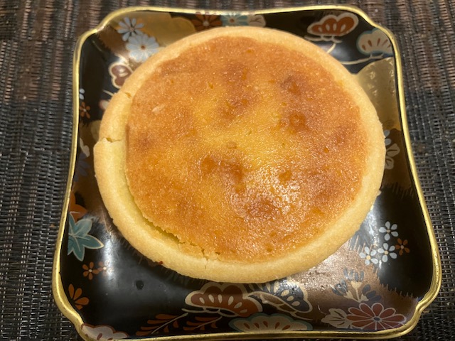 切ってみた感じ。アーモンドやココナッツの入ったタルト容器内にマドレーヌ風のふんわり触感のスポンジが入っており、食してみると、贅沢な風味が口の中に広がる、ブラックコーヒーにピッタリの美味しい欧風焼菓子なのだ🤤。