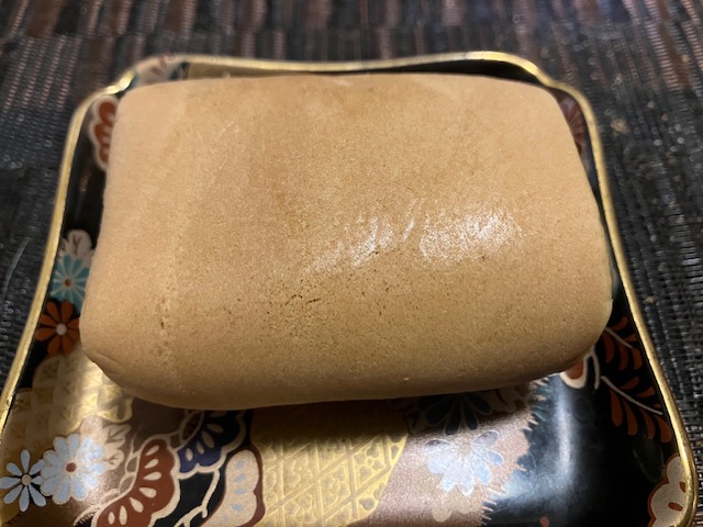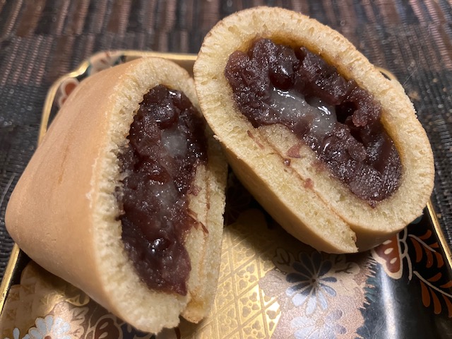 切ってみた感じ。中央部の求肥をつぶ餡で覆い、さらに焼皮で巻いたお菓子なのだ。食してみると焼皮にはしっとり感があり、つぶ餡は上品な甘み。中の求肥は大き目で、しっかり食べ応えのある、お茶請けにぴったりの美味しいお菓子なのだ😁。