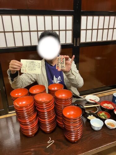 しかし、もしわんこそばを多く食べる目標ならば、このおかずにはぎりぎりまで手を付けてはならないのだ。もし100杯を目標とするのなら、満腹にならないように90杯くらいまではわんこそばをひたすら食べ続けるのがコツなのだ😁。