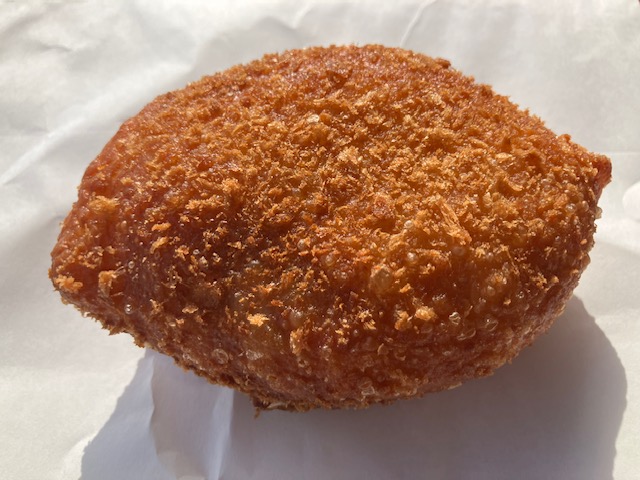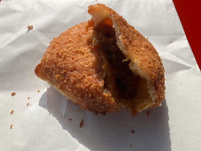 切ってみた感じ。見た目通り表面はサクサク生地で、中には辛さ控えめかつ旨味が強いカレールー。ちなみに形状はドーナツ形ではないのだが、「揚げ」工程を経ているので、カレードーナツなのだ😁。