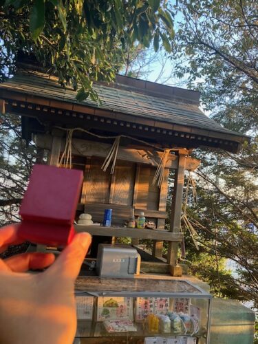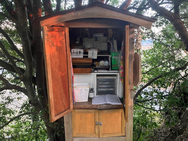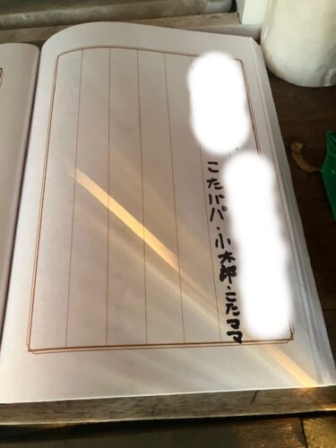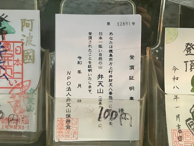 そして小太郎、こたママと本殿にお参り。本殿前の透明ケースの中から、各種お守りやお札などが購入可能なのだ。お代は左下の入金箱に投入する仕組みである。そしてこたパパは登頂証明書(100円)を3枚購入させて頂いたのだ🙂。