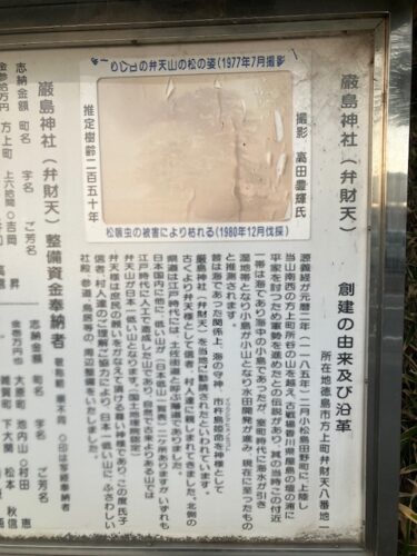 鳥居のすぐ横にある説明書き。実はこの山全体が厳島神社で、弁財天様がおられるのだ😲。