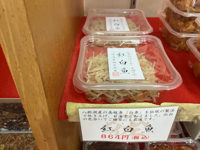 お店の方にお薦めをお伺いしたところ、「紅白魚」という商品とのこと。高級魚である白魚と川海老の佃煮で、紅白ということで縁起も良いらしいのだ。ということで、こたパパは今回「紅白魚(864円)」を一つ購入させて頂いたのだ😆。