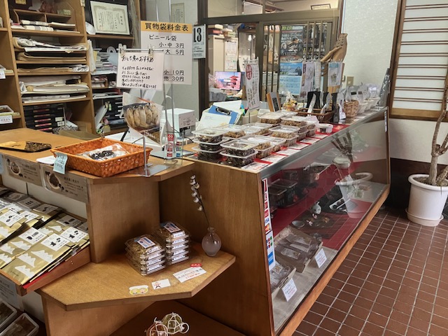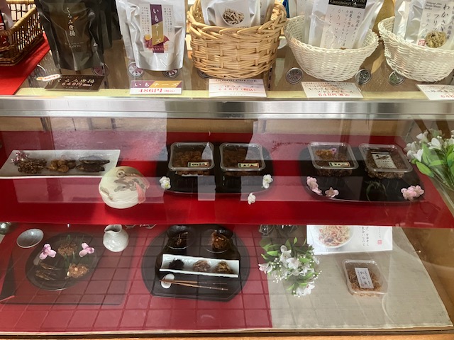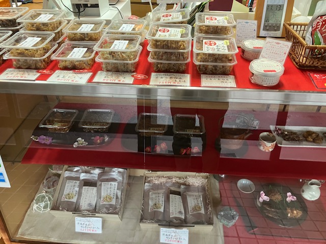 店内右手には、大きなガラス張りのショーケースが設置されており、近くの八郎湖で獲れた魚介類の各種佃煮が陳列されているのだ😄。