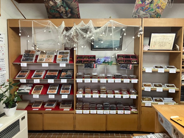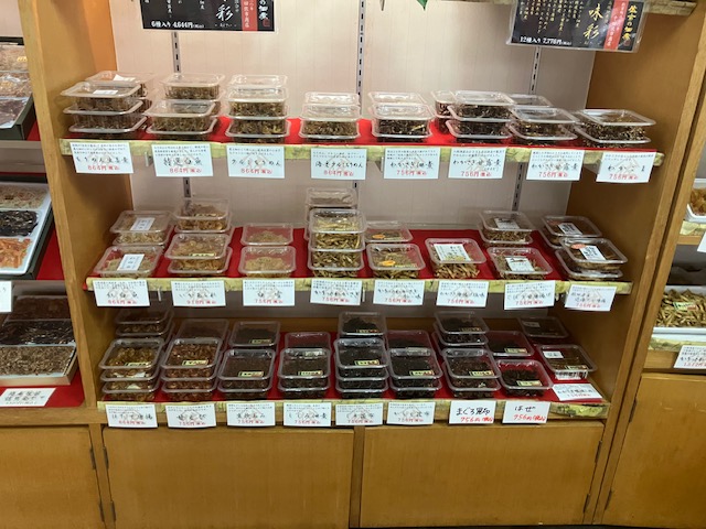 店内左手奥側には大きな壁面棚が設置されており、各種佃煮詰め合わせや、様々な種類の佃煮がずらりと陳列されているのだ。それにしても凄い品ぞろえだなぁ😲。