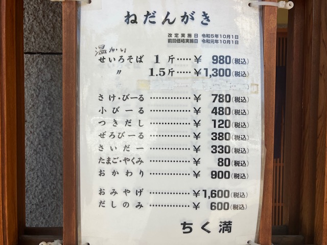 入口格子掲示のメニュー表。そばは何と1種類(せいろそば)のみなのだ😲。