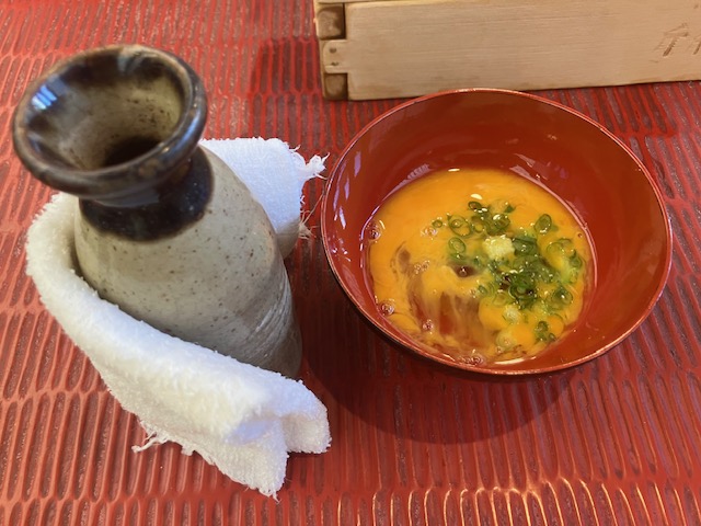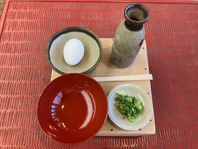 お椀に生卵を割り、ネギと出汁を投入するのだ。ちなみに出汁は熱々なので、徳利はおしぼりで持つのだ😁