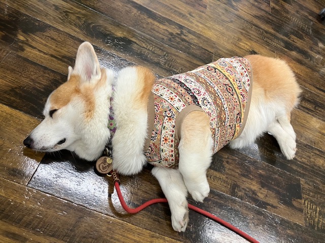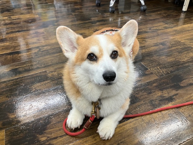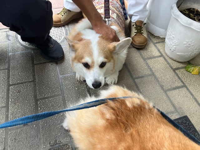 そしてこちらがリアル福君(9歳)である。お店では、ロングリードで繋がれた福君がいつも接客してくれるのだ。福君は男の子コーギーが苦手なのだが、女の子コーギーと人間には非常にフレンドリーだそうだ😅。