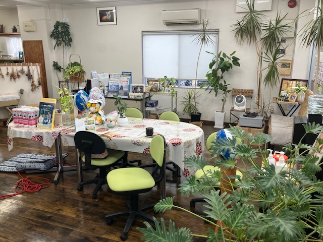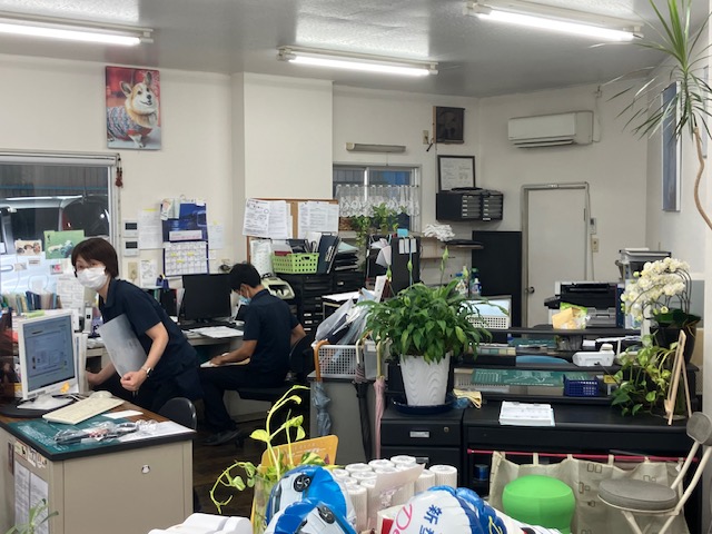 入口左右には、観葉植物の多い商談スペース。入口正面が事務スペースというレイアウトである😁。
