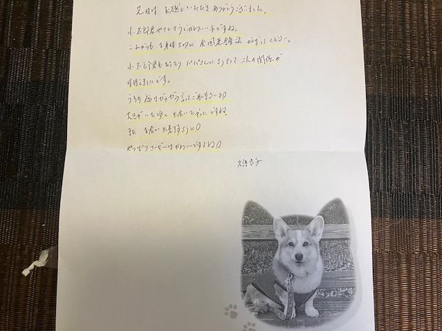 そしてこたパパは帰路に就いたのだが、ここで思わぬハプニング。お散歩バッグをお店に忘れてきてしまったのだ。途中のサービスエリアで気が付きお店に電話したところ、何と丁寧なお手紙と高級カステラまで付けて、すぐに宅急便で送り届けて下さったのだ。まったく申し訳なく有難いことである😌。
