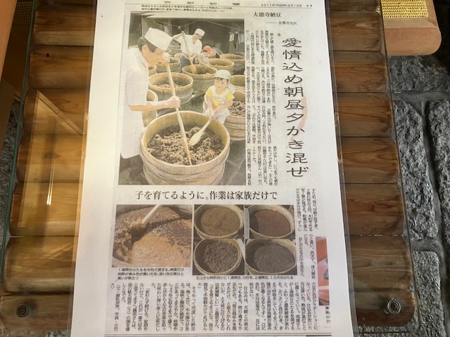 家族で大徳寺納豆を仕込んでる様子の新聞記事。年に一度、真夏の土用の日に木桶に仕込んで発酵させるのだ😁。