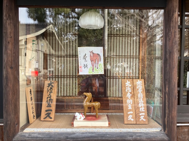 入口横の渋い木製ショーウィンドウには、干支である馬の人形や絵が陳列されているのだ😄。