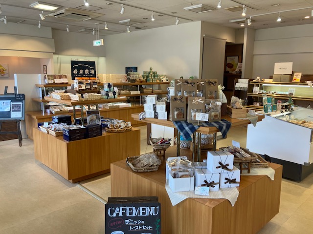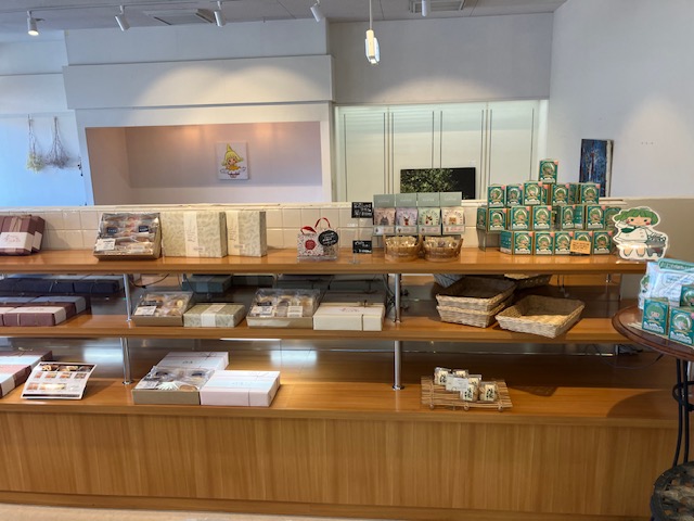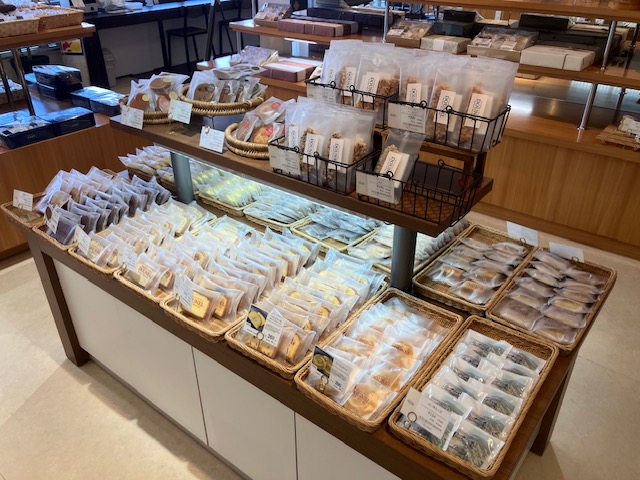 店内左手には、数個の平面陳列台と壁面陳列棚が設置されており、様々な種類のパンや焼き菓子の詰め合わせなどが陳列されているのだ😄。