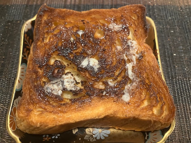 1枚はそのまま、もう1枚は軽く焼いてバターで頂いたのだ。熟練職人が54層をひとつひとつ三つ折りにし、完成まで3日もかかるそうだ。そのまま頂いても、外側はサックリ感、中側はしっとりふんわり感があり、小麦の旨味と若干の酸味を感じるのだ。焼くとサックリ感がパリ感に変わり、バター風味と卵黄のコクが相乗効果で楽しめるのだ🤤。