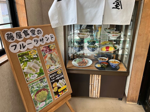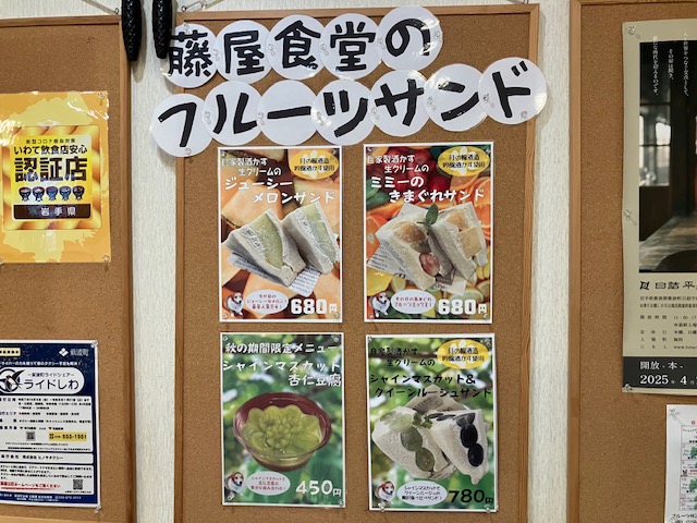 これが藤屋食堂名物のひとつであるフルーツサンド。何と生クリームに酒かすが使われているのだ😲。