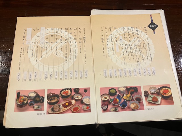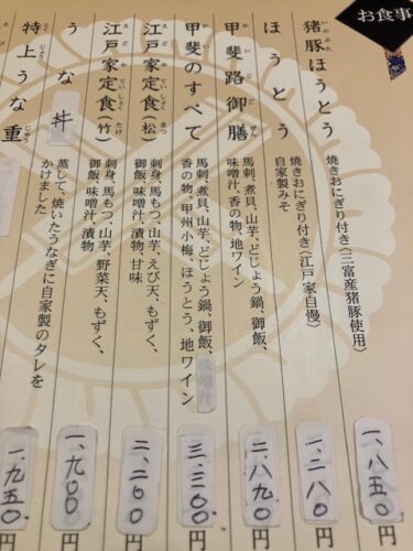 メニュー表。今回は夜ご飯だったので、ほうとうまで付いてくる「甲斐のすべて(3300円)」を注文させて頂いたのだ😆。