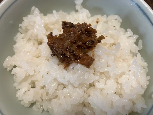 食してみると、商標登録されている「八幡鯛」のほぐし身を、国内産鰹と北海道南産昆布で炊かれた佃煮に、山椒と胡麻の風味がプラスされて、正に旨さの塊という感じ。この量でもご飯が少なすぎると感じられるほどの、納得の美味しさなのだ🤤。
