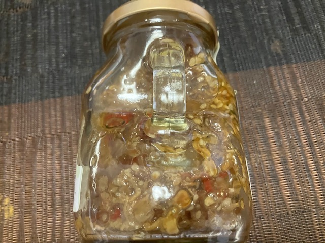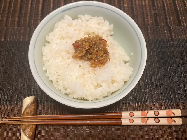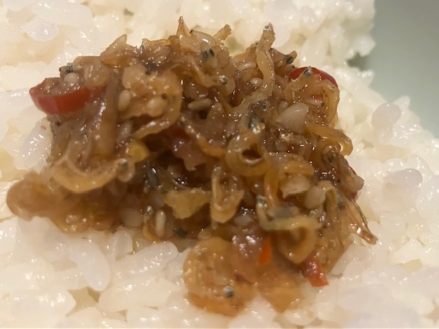 食してみると、ちりめんじゃこの存在感が大きいな。ニンニク、ごま、生姜にバジルと風味豊かな素材構成で、唐辛子の辛みがアクセント。もちろんあっというまにご飯が足りなくなるほどの美味しさなのだ🤤。