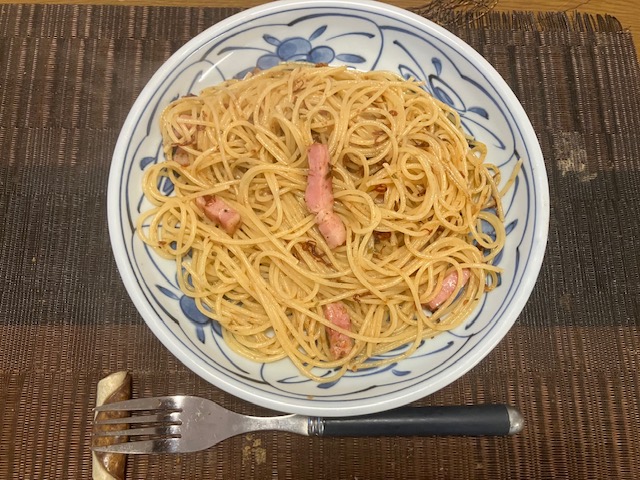 しかしこの商品の素材構成(オリーブオイル、ジャコ、ニンニク、唐辛子、バジル等)から考えると、一番アレンジに向いているのはパスタだろうな。ということでこの商品にベーコンだけを追加して、ペペロンチーノ風パスタを作ってみたのだ😁。