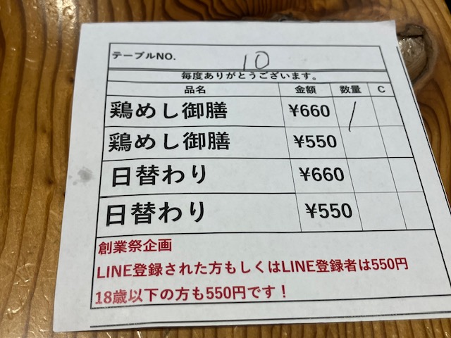 食べ終わって伝票を見てびっくり。この内容で660円は超破格すぎる。こたパパはさらにあとからLINE追加で、何と550円になったのだ。創業祭とはいえ、通常価格の半額は大盤振る舞いすぎるなぁ😲。