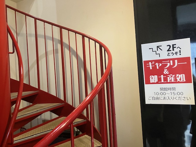 入口左手には赤いらせん上の階段があるのだが、2Fにギャラリーとお土産処があるようだな🙂。