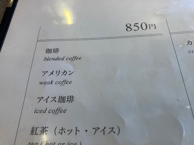 ここはもちろん「珈琲」一択だろう。ということで、今回こたパパは「珈琲(850円)」を注文させて頂いたのだ😆。