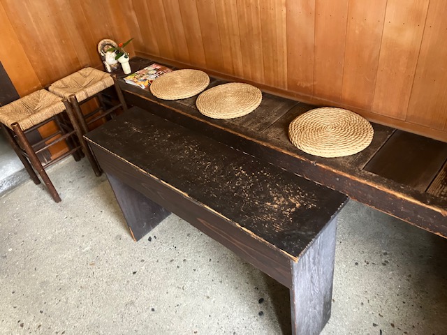 店内右手には、趣のある木製休憩ベンチ😁。