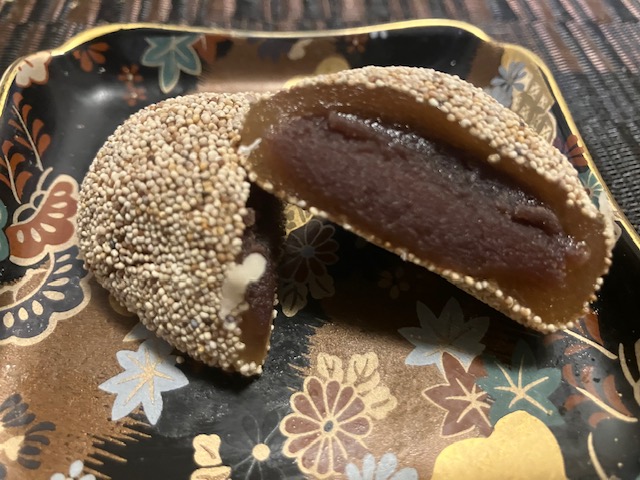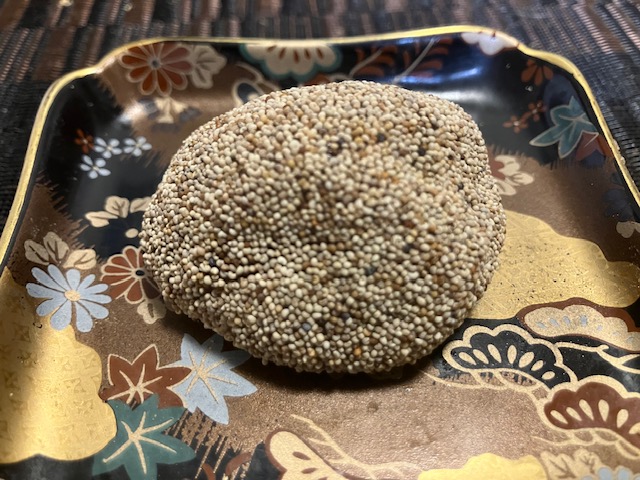 切ってみた感じ。食してみると求肥は非常に柔らかく、中のこしあんは瑞々しさが残っていて、ほんのりとした甘さ。お餅表面のけしの実のプチ感が何とも楽しい。かの千利休も愛したと言われるこのお店の「芥子餅」は、正にお茶請けにピッタリの美味しさなのだ🤤。