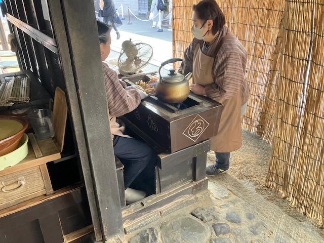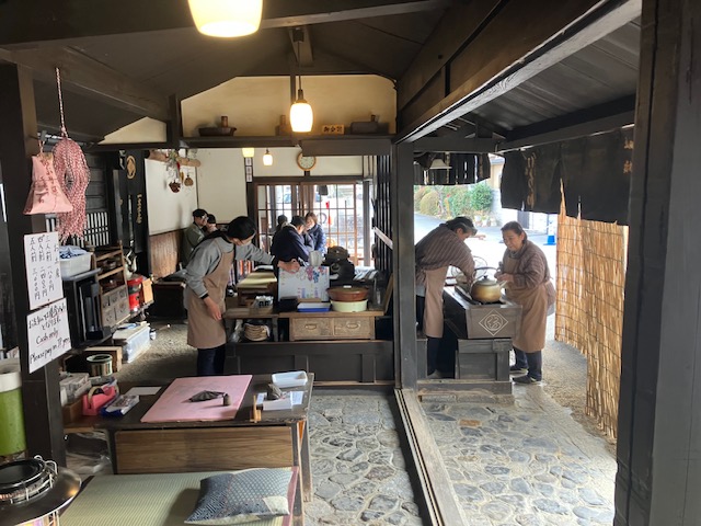 店内は石畳。写真右手のお二人が餅を焼かれているのだ😁。