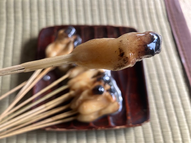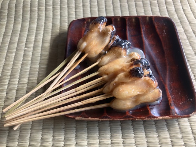 お餅にきな粉をまぶして焼き、白味噌をつけたもの。形状はいかにも手作り感があるな。お餅の焦げ部分がアクセントで、甘い白味噌との相性抜群。11本があっという間になくなってしまうほどの美味しさなのだ🤤。
