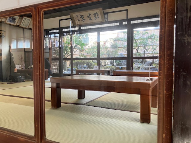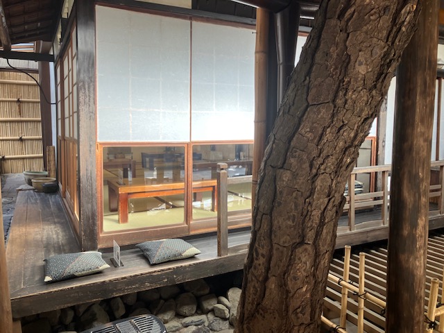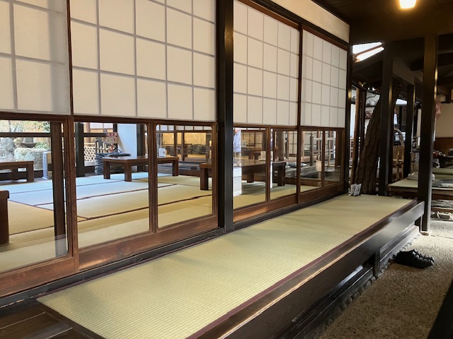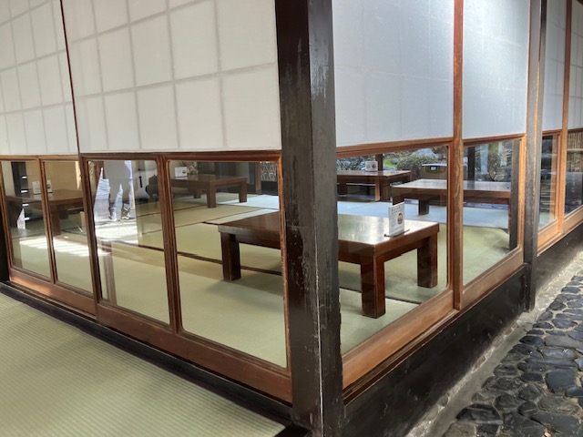建物内は非常に広く、手前側に一人掛け用のテラスベンチ席があり、その奥側には趣のある和室があるのだ😁。