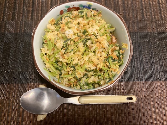 賞味期限は1週間ほどあったのだが、やはり一人では量が多かったので、大量消費のためのあるレシピを考えたのだ。それが「壬生菜チャーハン」である。具材はシンプルに壬生菜漬と卵のみ。調味料も最小限にして、壬生菜漬を味わう作戦。これもかなり美味しかったなぁ🤤。