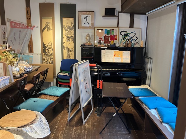 店内右手には広めの休憩スペースとなぜかピアノ。なかなかユニークなレイアウトである😄。