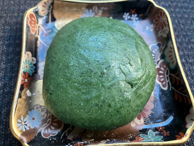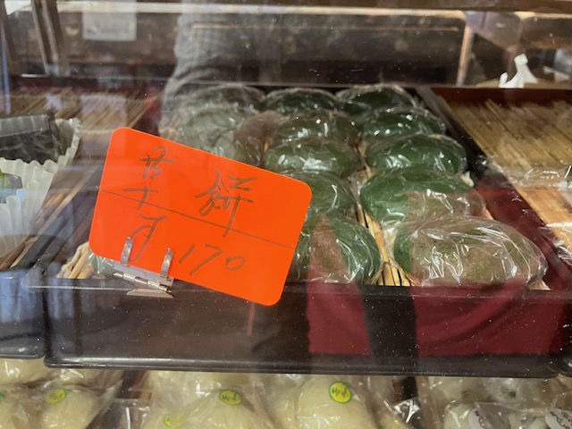 女将さんにお薦めをお伺いしたところ、人気が圧倒的に高いのがよもぎ100%使用の「草餅」とのこと。ということで、今回こたパパは「草餅(170円)」を一つ購入させて頂いたのだ😆。