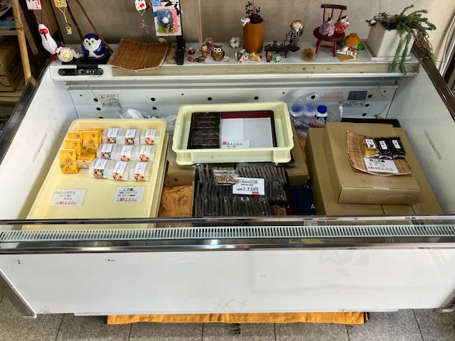 入口右手の冷蔵ケース内には、各種羊羹とくず餅など🙂。