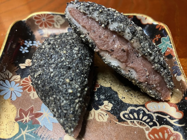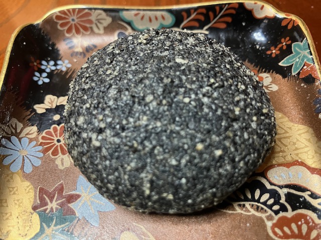切ってみた感じ。表面の皮は摺って煎った胡麻でびっしり覆われているのだが、食してみるとお餅表面を覆う芳醇な胡麻の香りが鼻に抜ける感じで、中の滑らかで瑞々しいこしあんとの相性もバッチリ。個性的かつ素朴な美味しさのお饅頭なのだ🤤。