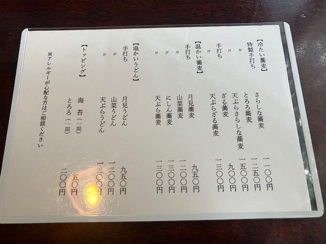 メニュー表。よく見ると「手打ち」と「特製手打ち」があるんだな。このパターンは、間違いなく右端がお勧めだろう。ということで、こたパパは今回「さらしな蕎麦(1100円)」を注文させて頂いたのだ😆。