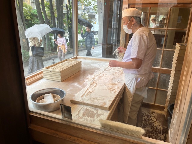 ちなみにそば打ちは店内からも見学可能なのだ。それにしてもきれいなお蕎麦だなぁ😲。