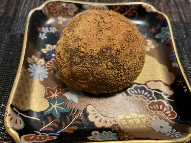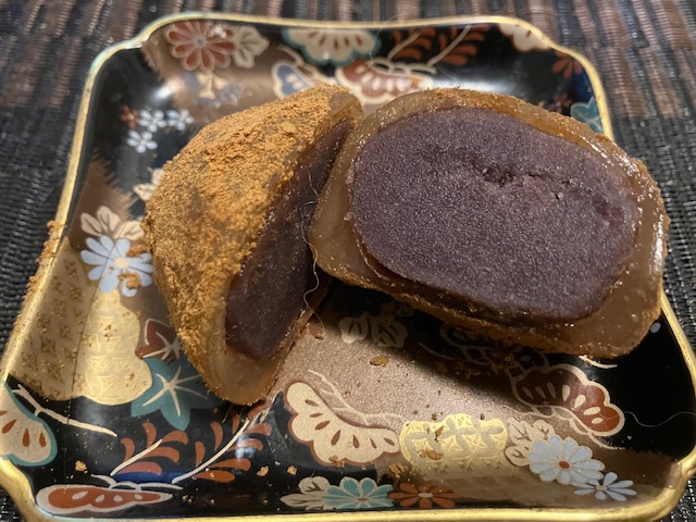 切ってみた感じ。食してみると、外側のわらび餅はプルプル食感で、中のこしあんはしっとりしており、外側のきなことの相性が抜群。わらび餅ながら非常に食べ応えのある一品なのだ🤤。