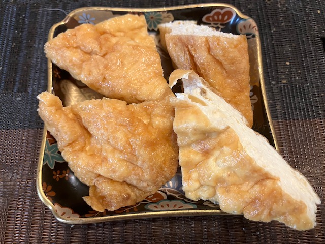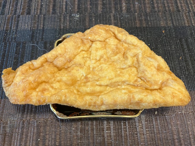 女将さんにお薦めをお伺いしたところ、何といってもお店の代表商品である二代目が考案された「三角油揚」とのこと。そういえば、表の看板ものれんにも一押しだったなぁ。そして幸運なことにラスト1個が残っていたのだ😄。