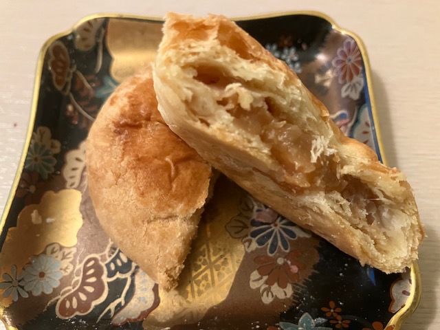 切ってみた感じ。小さいサイズながら、外側のパイ生地はしっとりサク感があり、ラム酒の入ったカスタードクリームと中のアップルは程よい甘さで、シナモンとレモンのおかげで後味さっぱり感の美味しいアップルパイになっているのだ🤤。