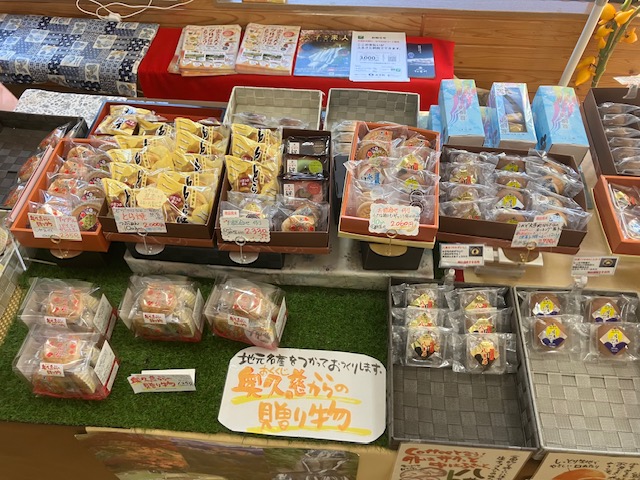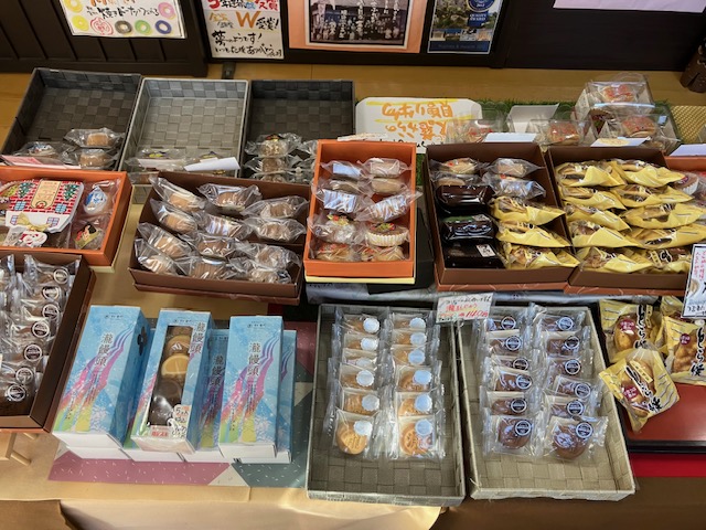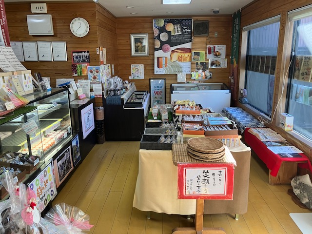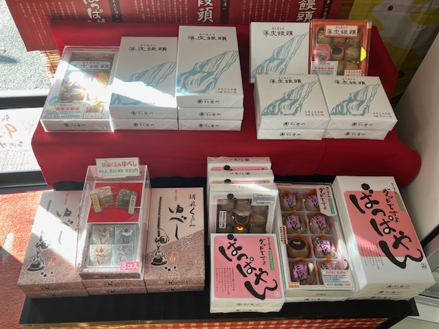 入口左手陳列台には、代表銘菓の一つである薄皮饅頭やゆべしなどが陳列されているのだ😁。