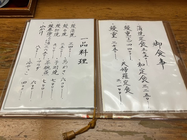 メニュー表。こたパパは鰻店において通常鰻重(竹クラス)を注文させて頂くのだが、今回は鰻重が2種類しかなかったのだ。ということで、今回こたパパは「鰻重(上):4400円」を注文させて頂いたのだ😆。