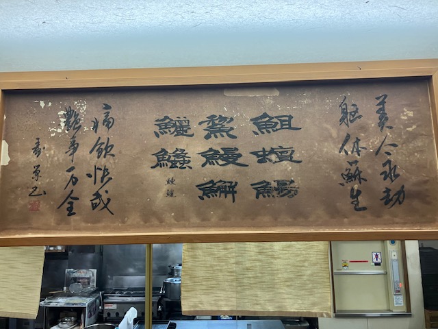 こちらはカウンター上部壁面に掲示されている書。こたパパには正直意味不明である😅。