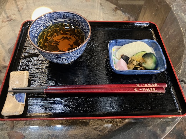 嬉しいことに、このお店ではお茶とお漬物セットが提供されるのだ🤤。