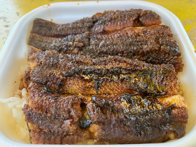 10分程待って受け取ったのがこちら。関東風背開きで関西風の蒸さずに焼くスタイルである。ちなみにご飯大盛無料なのだ😁。